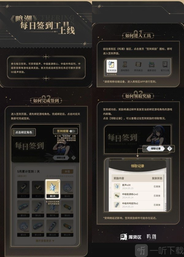 前往下载库洛官方玩家社区【库街区】,于【鸣潮】页面进行每日签到操作,即可获取相应奖励(奖励将直接发送至您的邮箱,无需另行兑换)。