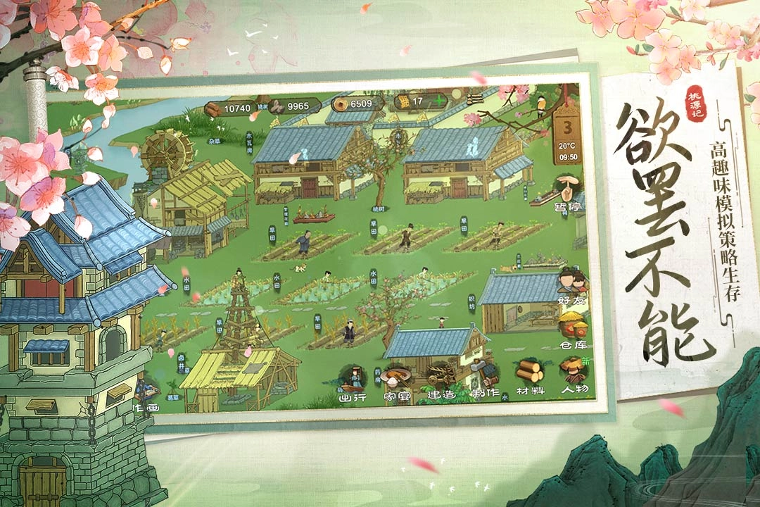 《桃源记》是一款休闲向的模拟经营游戏,其创作灵感源自东晋诗人陶渊明笔下的《桃花源记》。故事设定在唐朝末年安史之乱后,军阀割据、战乱频仍的背景下,流离失所的百姓为躲避战火,在一处隐秘谷地开启了重建家园的历程。玩家将以管理者的身份,指挥村民采集资源、调配人力、繁衍人口,从搭建基本生存的村落起步,逐步将其打造成令人向往的世外桃源。游戏采用中国传统国画作为美术基调,视觉上着重运用中国画的写意与白描技法;在山峦、溪流、世界地图等场景的呈现上,主要参照北宋画家王希孟的《千里江山图》,力求营造出仿若穿越时空的沉浸感。游戏中四季流转、节气分明,每个时节都对应着适宜的农事活动,种植何种作物全由玩家决策——收获的不仅是果腹的粮食,还能将各类食材搭配烹饪,制作出丰富的家宴,与邻里共享美食之乐。