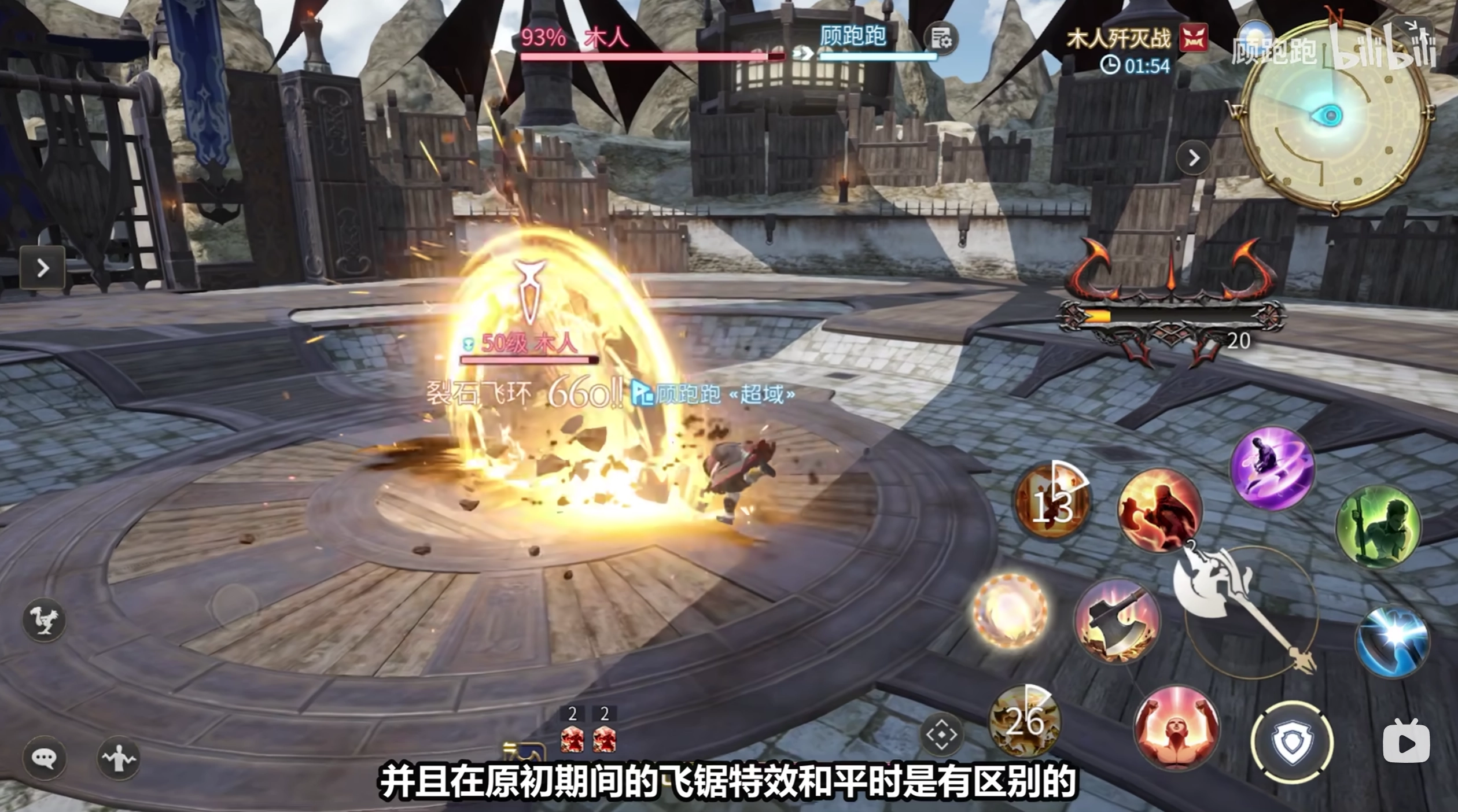最后是50级大招【原初的解放】,其效果为在5秒内释放【动乱】与【裂石飞环】无需消耗“兽魂”,而且必定直接暴击,这基本与端游相同。开启解放后,仅使用飞锯和动乱技能,总共能打出5发飞锯,并且在原初解放期间,飞锯的特效与平常有所不同。