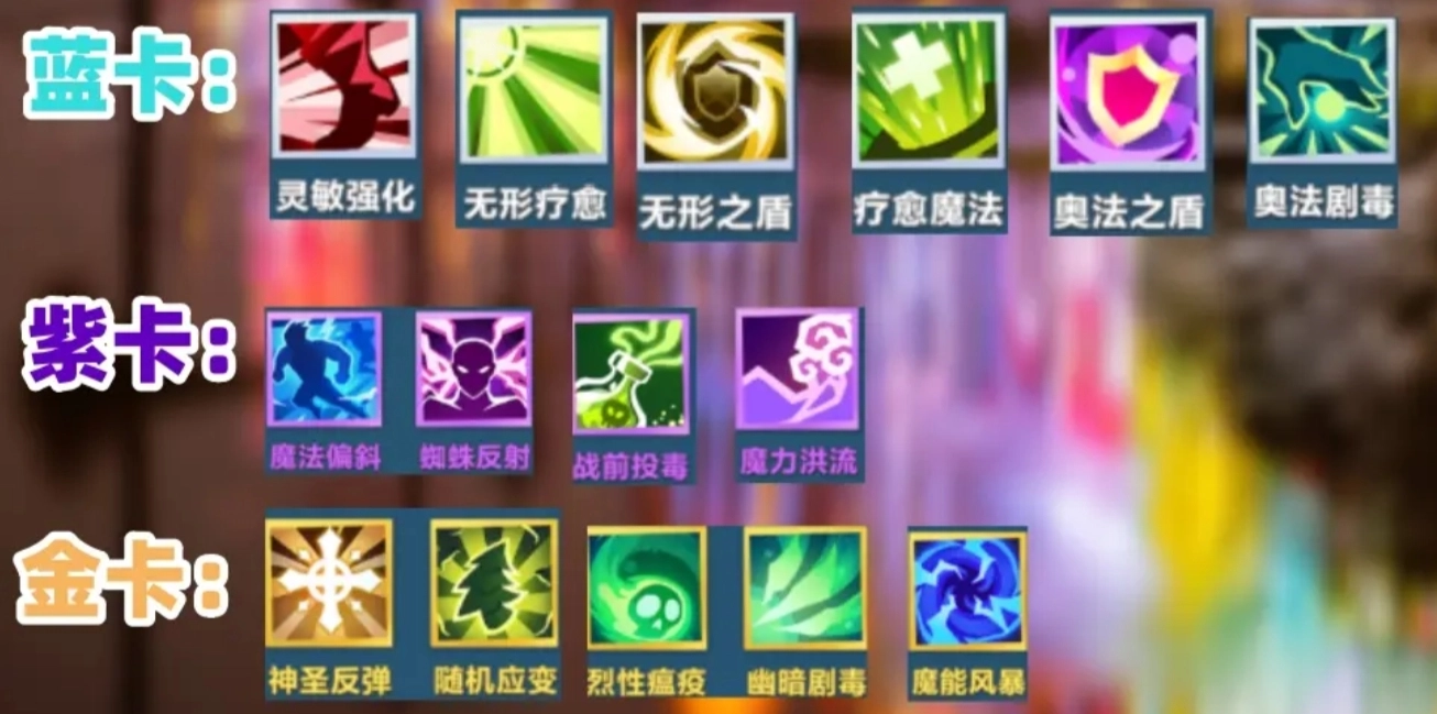 持续积累并强化自身的闪避与中毒能力,能在战斗中逐步占据优势。在蓝卡的选择上,可挑选灵敏强化、无形疗愈、无形之盾、疗愈魔法、奥法之盾、奥法剧毒等卡牌,以此增强自身闪避、治疗及抗性。其中,灵敏强化可提升森林游侠的敏捷属性;无形疗愈与疗愈魔法能为森林游侠赋予持续的生命恢复能力;无形之盾与奥法之盾可增强森林游侠的防御能力;奥法剧毒则能进一步强化森林游侠的中毒效果。