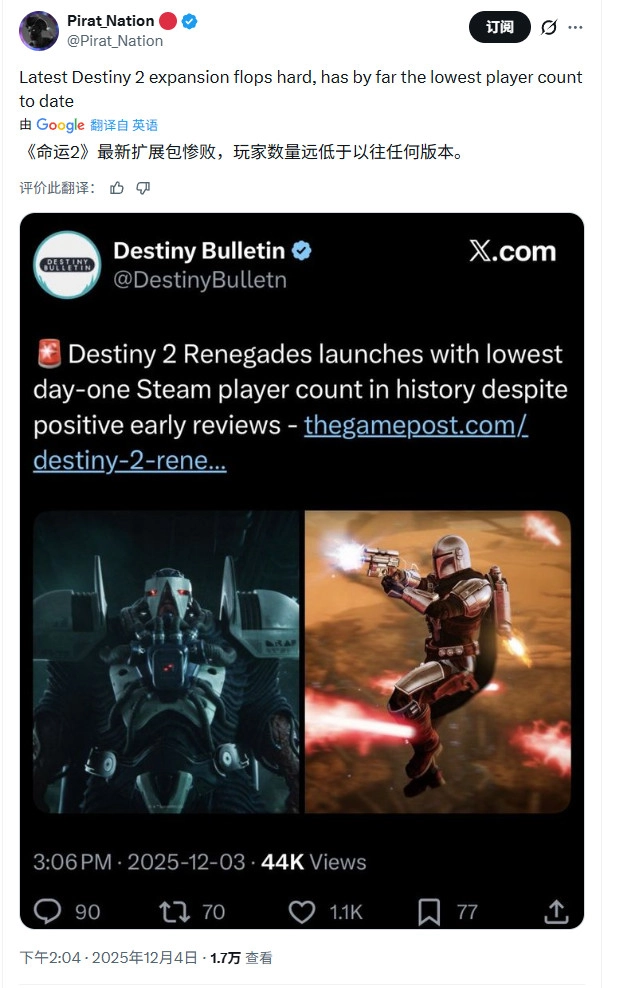 值得一提的是,“宿命边缘”上线时Steam玩家人数峰值达到98211人,而在“反叛”上线期间,《命运2》的Steam在线峰值仅约7万人,这一数据创下了该游戏所有资料片上线时的最低纪录。