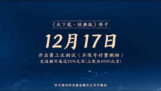 12月17日,《天下贰·经典版》将进行第三次测试,欢迎各位少侠持续关注和参与!经典版本天下贰的未来,由你们来决定!