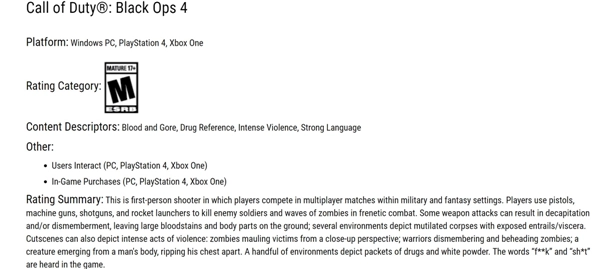 《使命召唤15:黑色行动4》明显不适合儿童游玩。今日,该作的ESRB评级正式公布,被评定为“M”级(即17岁以下禁止游玩)。ESRB指出,《使命召唤15》存在“极度血腥的画面、毒品相关暗示、非常暴力的内容以及脏话”,由此可见其确实不适合未成年人接触。此外,这份评级还披露了游戏的部分细节,例如游戏内包含内购机制。