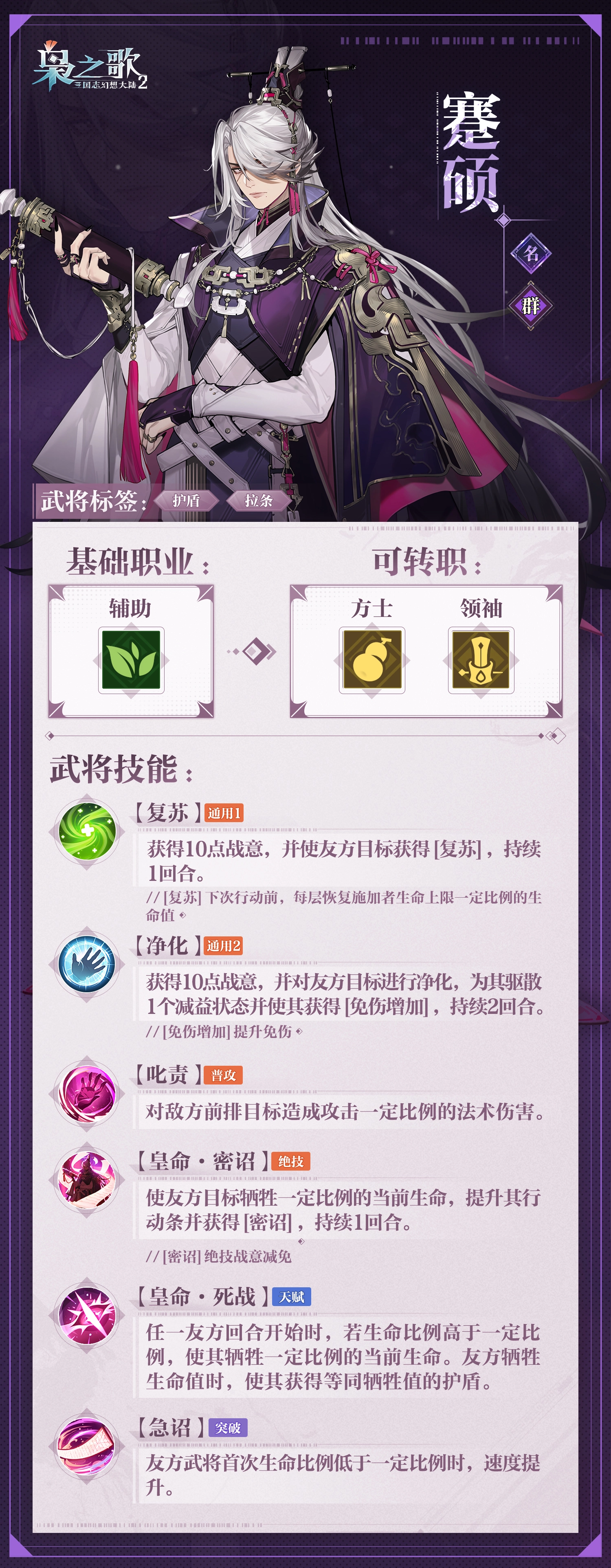 基础定位:群雄阵营中名将级别的辅助型武将,核心专长为行动条的操控以及血量策略的管理,同时还具备护盾保护与战意减免的能力。