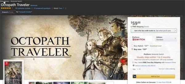 任天堂负责《八方旅人》在美国市场的发行事宜,因这款游戏人气爆棚,亚马逊网上商城的库存早早便销售一空。看来不仅SQUAREENIX没预料到游戏会如此热卖,就连经验丰富的任天堂这次也失算了。当前Switch版《八方旅人》已登上美国亚马逊游戏畅销榜首位。尚未买到游戏的用户,补货还需等待1-2个月!