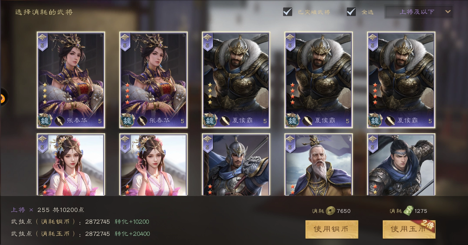 在武技点转换界面,选中想要分解的武将,即可将其分解为武技点。以下为分解不同武将所能获取的对应武技点明细表。
