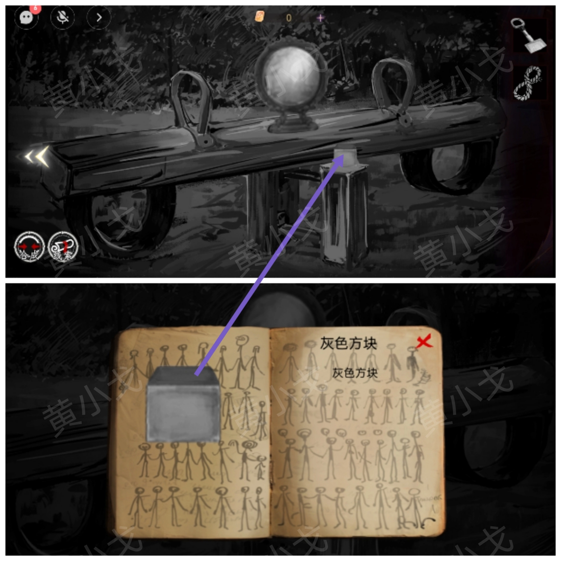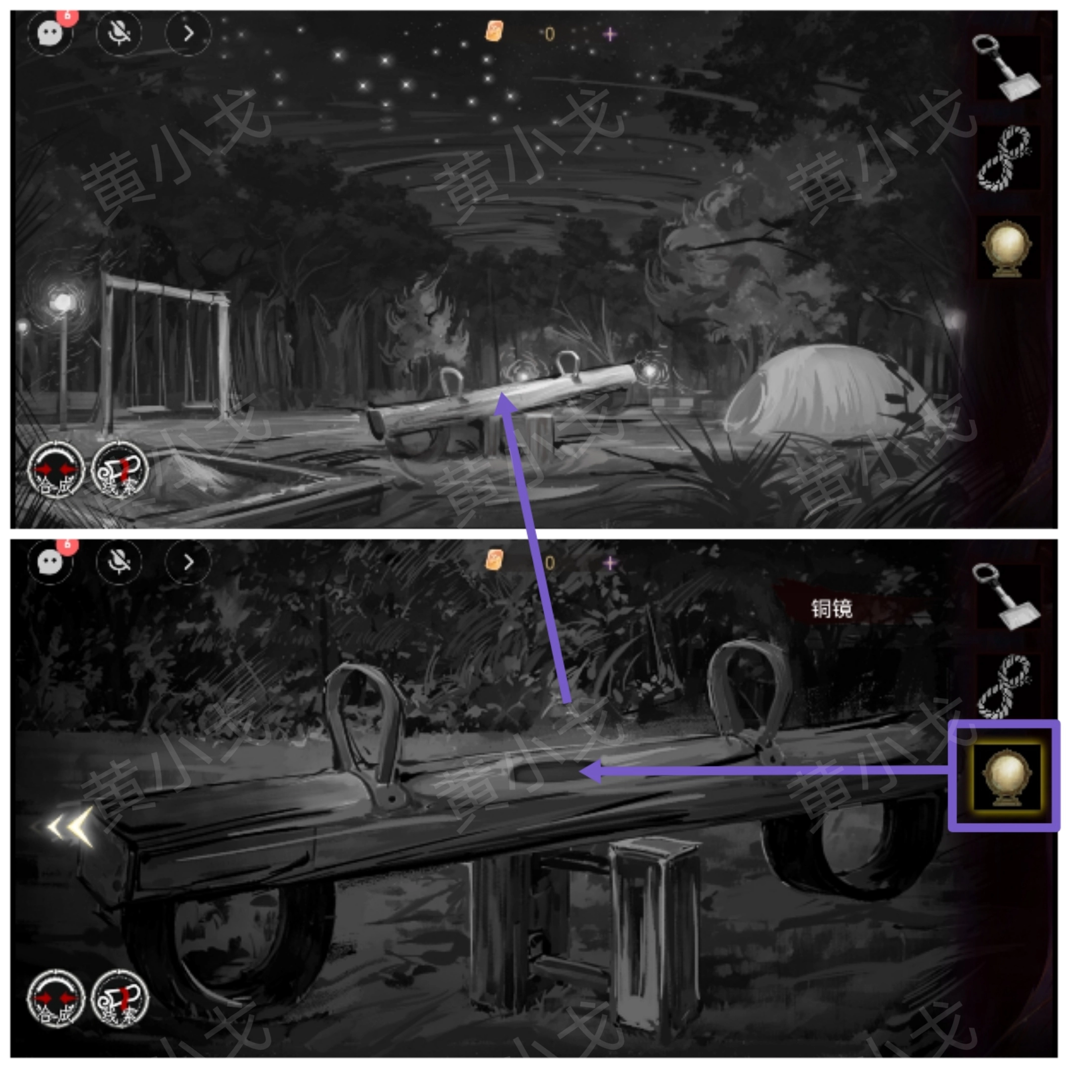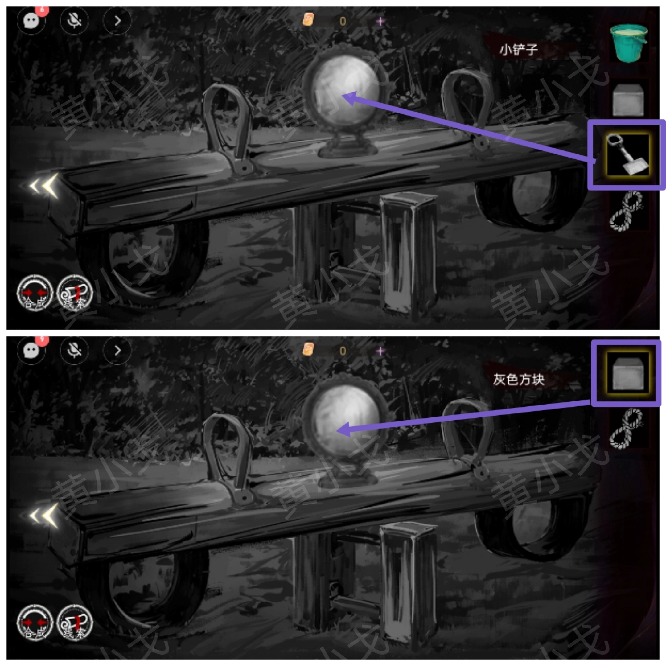 5.把【小铲子】和【灰色方块】放入铜镜传给队友