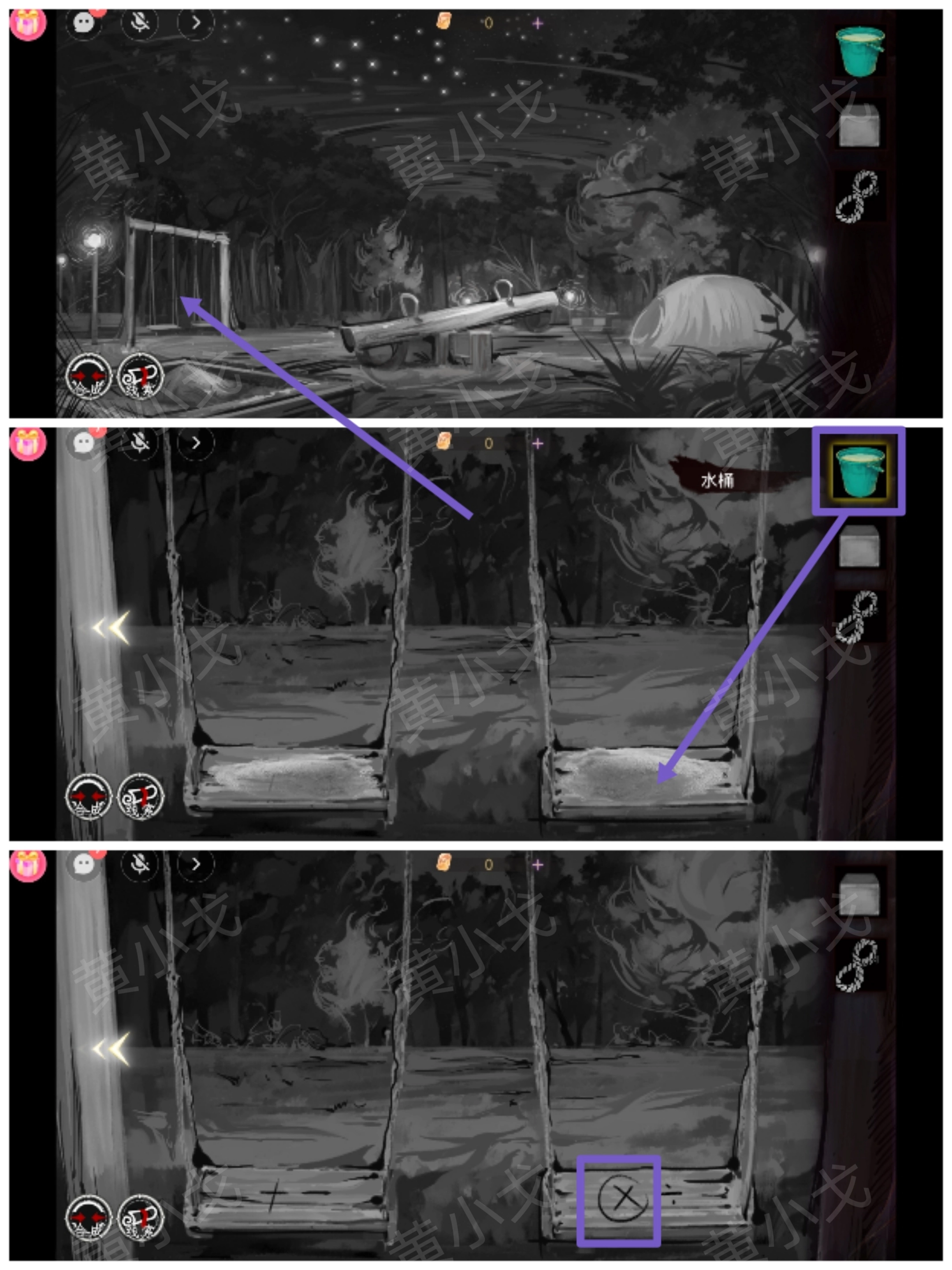6.点击秋千,使用【水桶】,获得线索,告诉队友