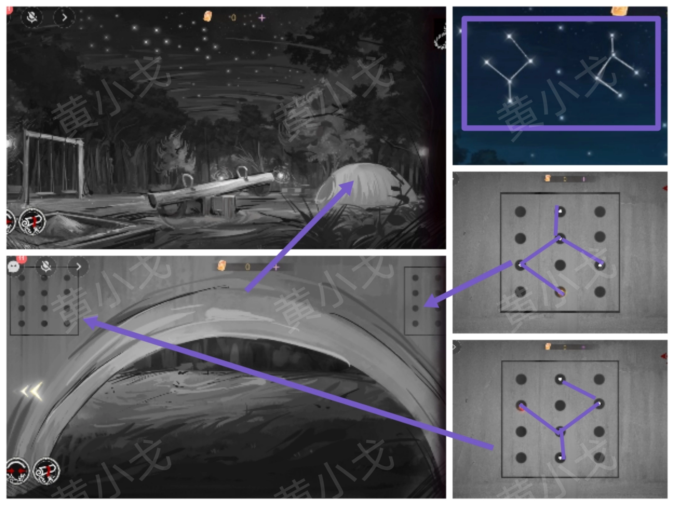 7. 轻点小建筑左右两边的点阵,依据队友所提供的星宿线索,完成点阵的排列。