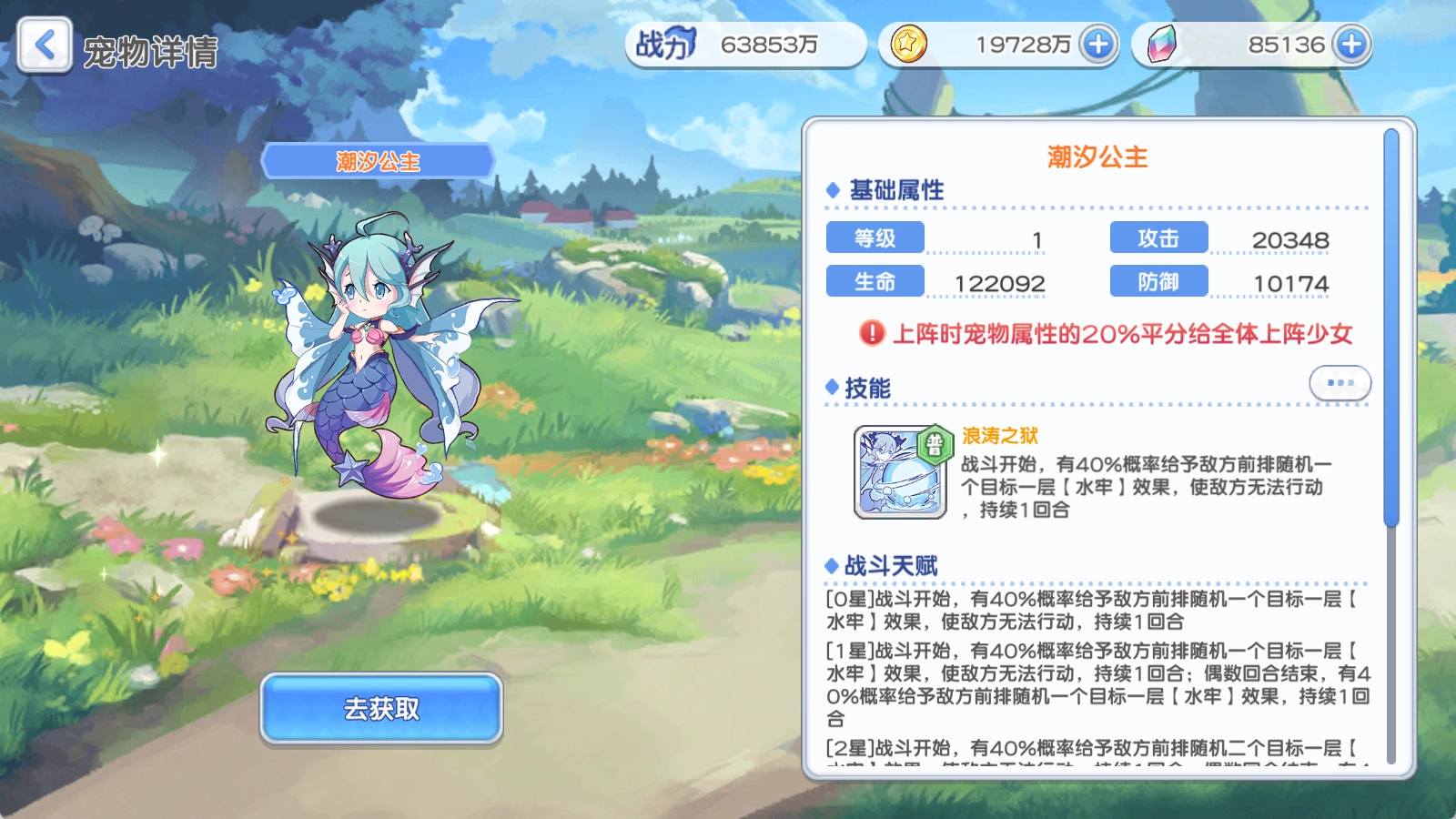 潮汐公主:最近热度较高的钻石(特别是钻二)四光暗生存高压深渊,让我忍不住要谈谈这个宠物。它仅在生存高压环境下有用,三星可用,五星用起来效果更好。需要留意的是,前期人鱼的优先级高于战士。在前期多数环境中,生存比回能重要,只有站得住才能有输出。到了后期,战士回能的效果其实并不显著,当下作用比较有限。特别来讲讲四光暗行动扣血深渊,这是个对配置要求颇高的副本。可以试着用五星摩多去凹破盾,搭配高星人鱼凹水牢,最终效果基本能和赫卡特加 高星人鱼的水牢持平,但从概率上看,会比赫卡特更难凹一些,虽能打出伤害,但不会太高。这种深渊的完美解决方案,还是得靠茉尔斯塔这张在高强压力环境下的控制卡,用上述方法和用沫儿打出的伤害,基本会相差几倍。要是这些都没有,那就只能无奈接受了。