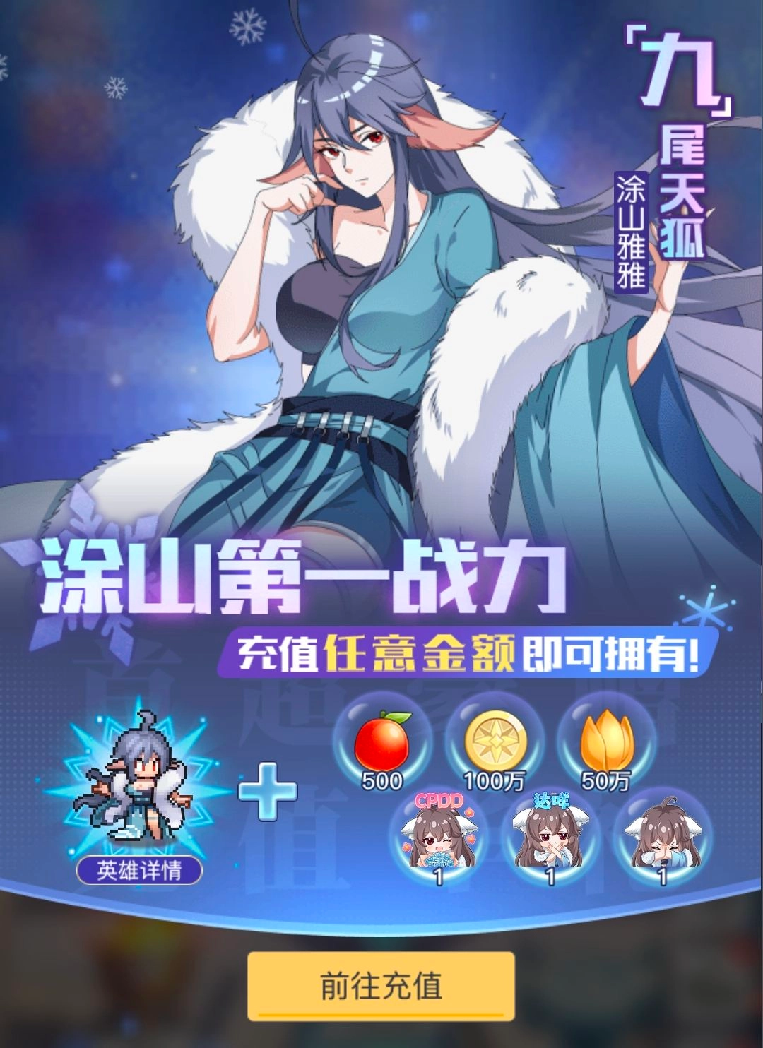 4.涂山雅雅:任意充值即可获得,有控制有减速,前期的输出也不错。