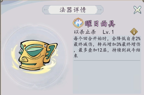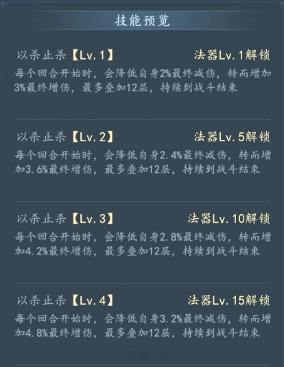 以杀止杀【Lv.1】法器Lv.1解锁每个回合开始时,会降低自身2%最终减伤,转而增加3%最终增伤,最多叠加12层,持续到战斗结束