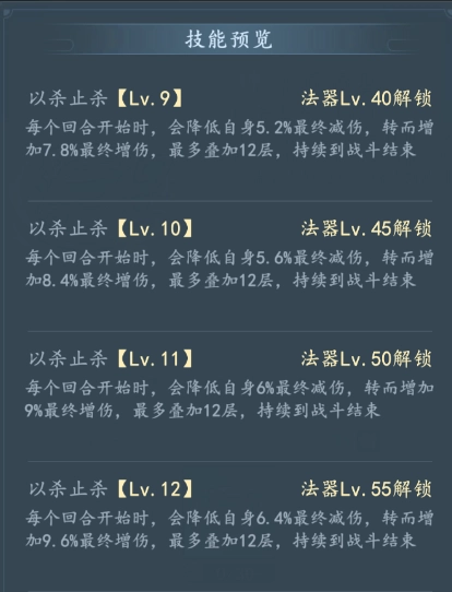 以杀止杀【Lv.11】法器Lv.50解锁每个回合开始时,会降低自身6%最终减伤,转而增加9%最终增伤,最多叠加12层,持续到战斗结束