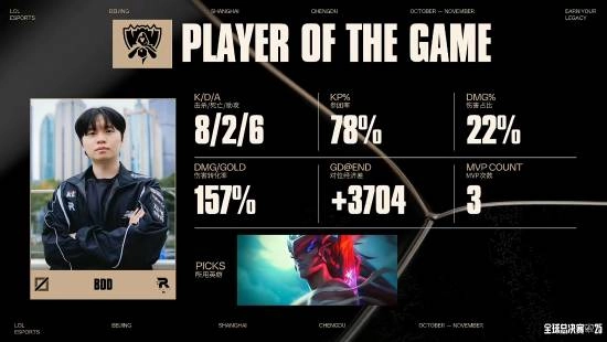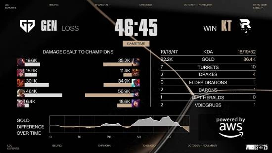 38分钟时,GEN对KT的高地发起进攻,Ruler操控的伊泽瑞尔输出爆炸伤害,GEN成功击溃KT四人并推平对方基地,最终拿下这场比赛的胜利。