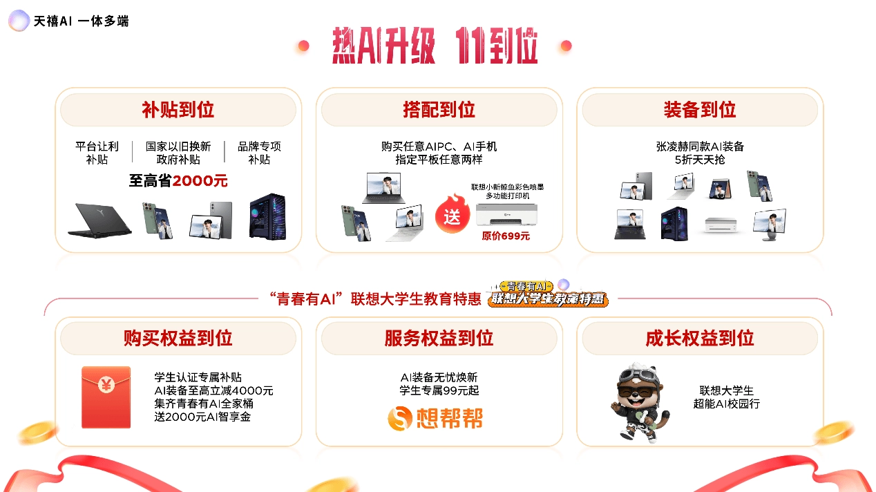 双十一的脚步越来越近,联想也带来了“热AI升级 11到位”的超值福利活动,为消费者准备了六重惊喜:第一重是“补贴给力”,把国家以旧换新补贴、品牌自身补贴和平台补贴整合起来,部分机型最多能省下2000元。针对大家的搭配购机需求,有“搭配超值”福利,只要购买任意PC或平板,相关配件就能享受限时五折的优惠打包购买;对于选择特定手机型号的用户,还会直接赠送价值299元的专属AI耳机;要是在AI PC、指定AI手机和AI平板这三类产品中任选两样,价值699元的打印机就能免费带回家。另外,双十一期间在联想官方店铺下单,还有机会以五折的价格抢购张凌赫同款的AI装备。