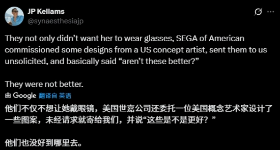 近日,又一位前白金工作室成员JP Kellams也透露了部分内幕,还晒出了角色的早期设计图。他表示:“他们不仅不希望她戴眼镜,世嘉美国分部还特意找了美国概念画家做了好几版设计方案,没跟我们商量就发了过来,那语气差不多就是在说:‘这些设计难道不比原来的好吗?’”