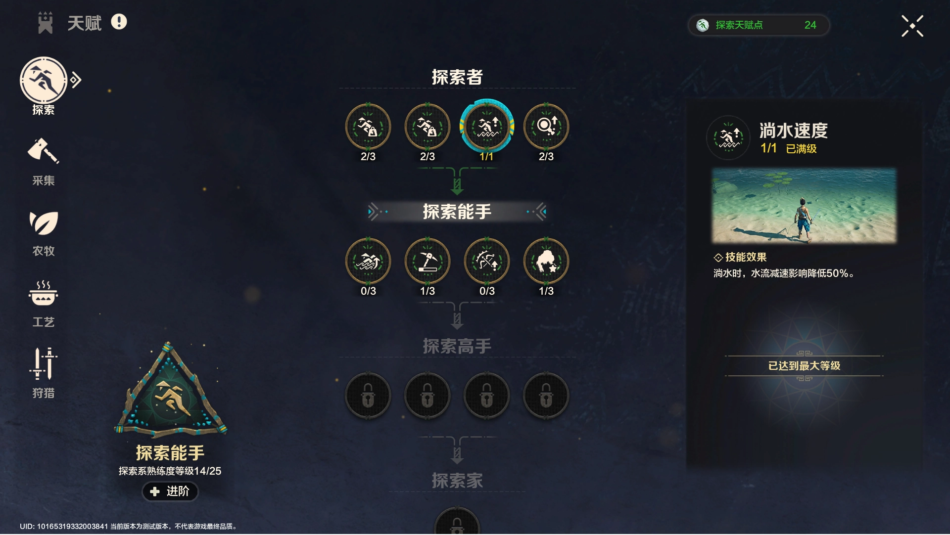人物天赋分为“探索、采集、农牧、工艺、狩猎”五个大类。