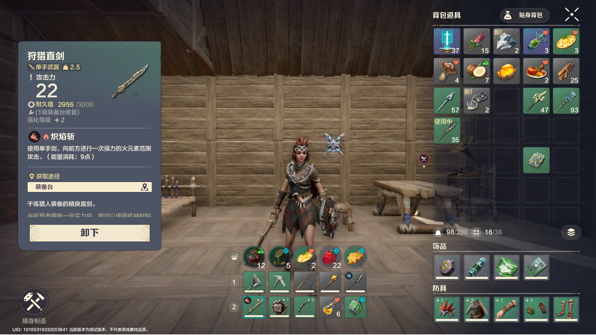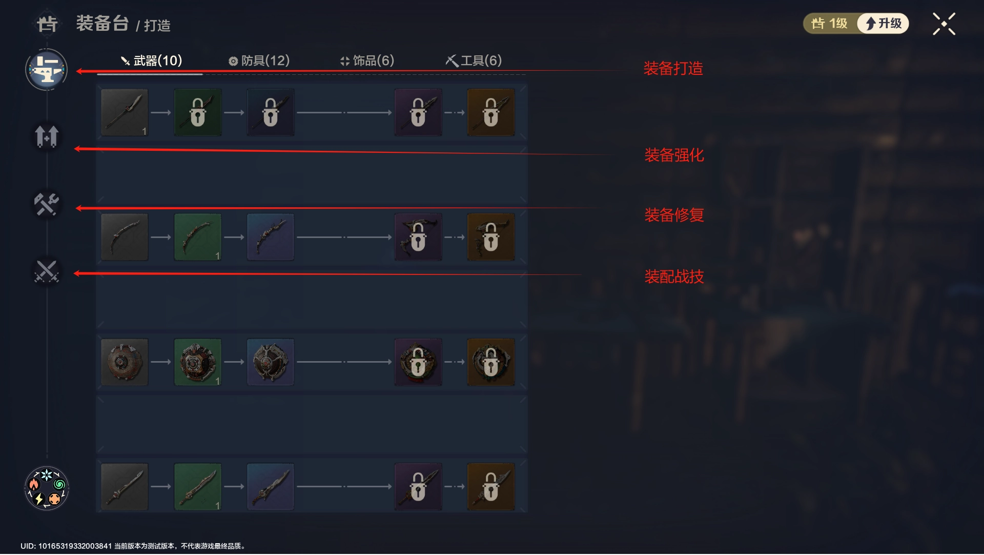 荒野起源的角色可以穿戴5件装备,4个饰品。升级可以解锁更高品级的装备的制作配方,装备制作出之后,可以消耗素材进一步强化武器等级。