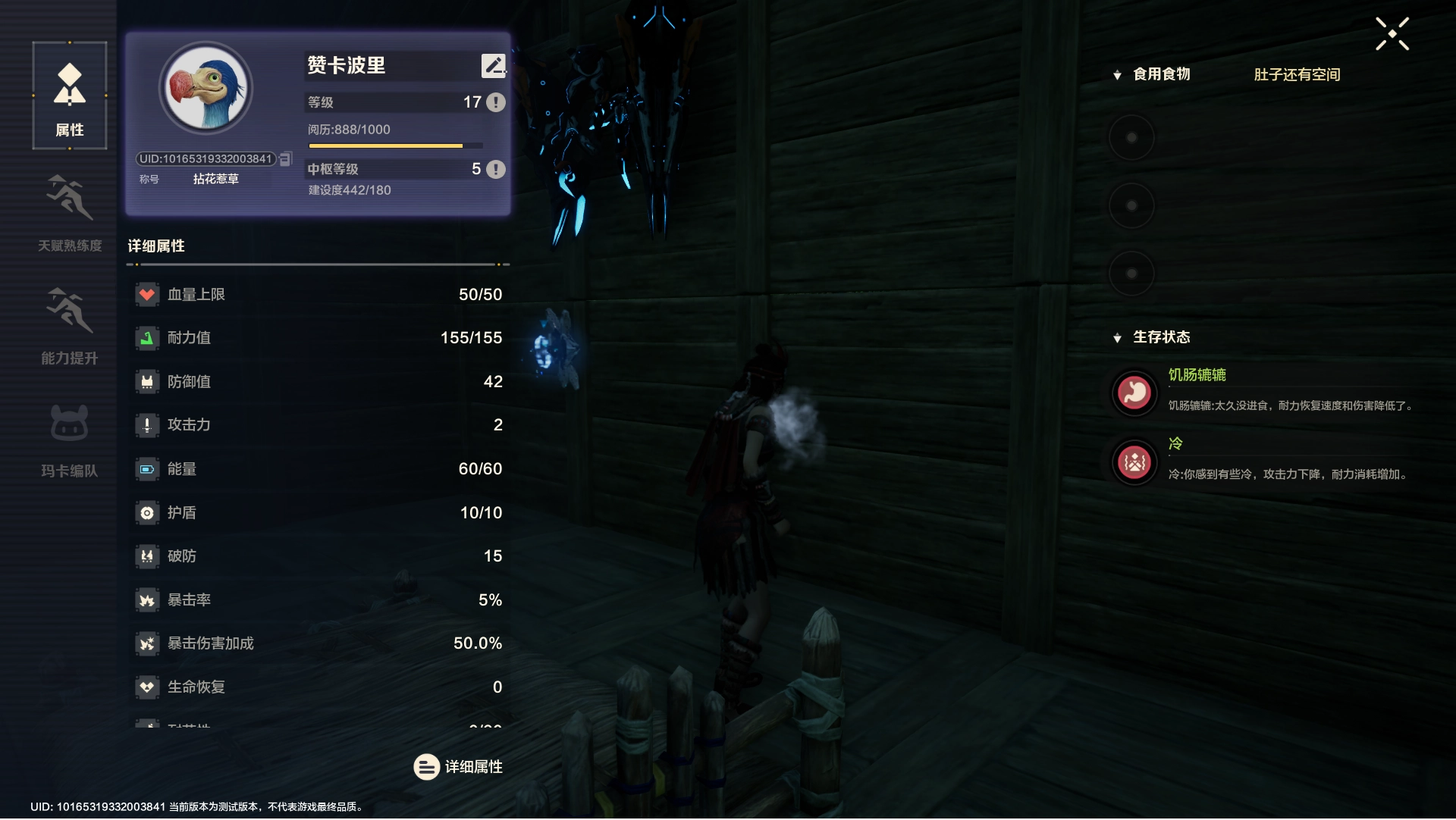 当处于下雨天,角色一旦被雨淋湿或者跳入水中,便会即刻进入潮湿状态,致使其耐力恢复速度下降。而当夜晚降临,亦或是角色身处雪山等寒冷区域时,就会进入寒冷状态。倘若食物消耗殆尽,角色则会进入饥饿状态,进而降低伤害输出以及回复速度。针对这些异常状态,可借助烤火、在房间内休息、进食等一系列方式予以消除。