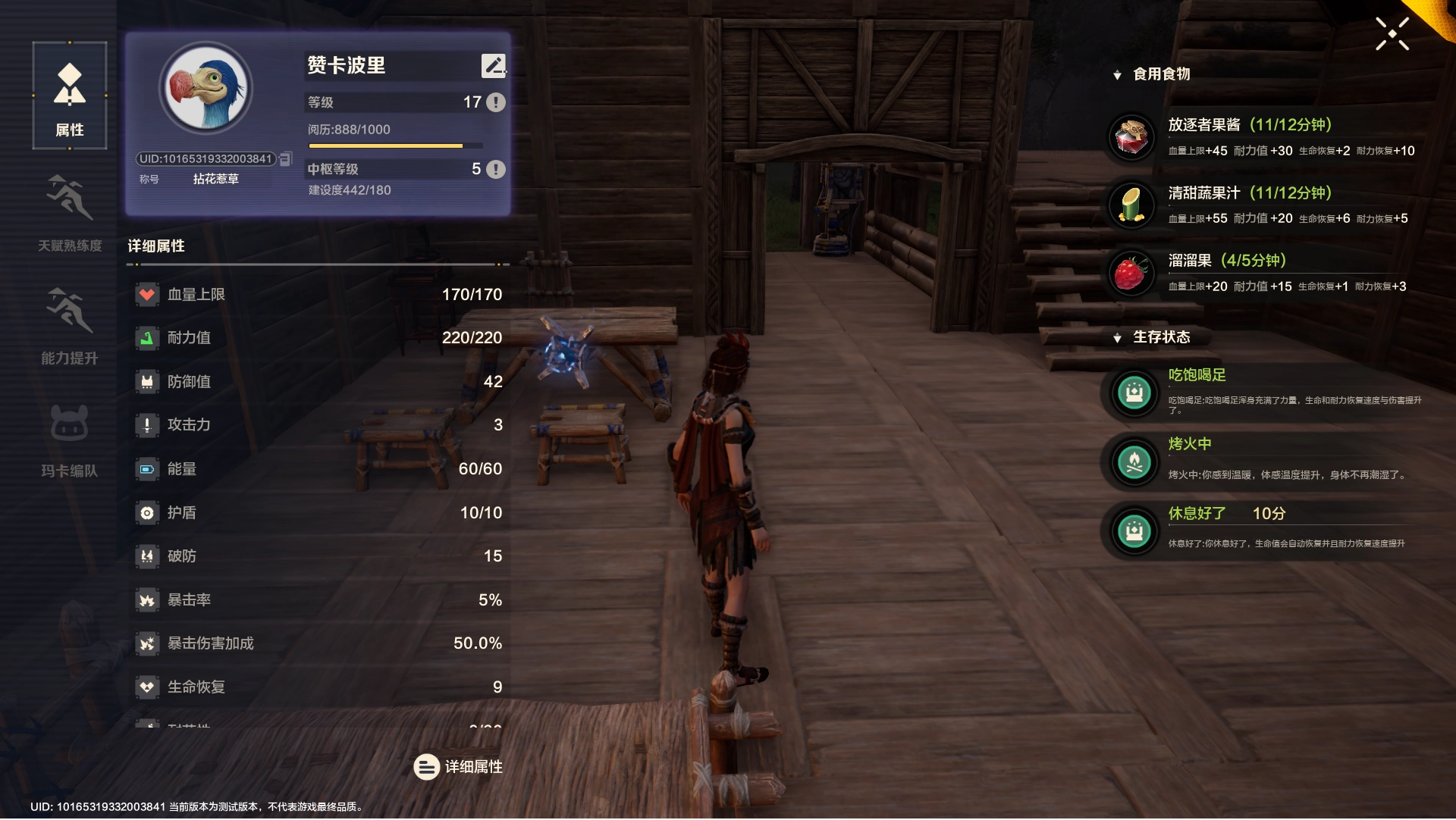 另外,在游戏中,按时吃饭,在有篝火的房间休息,会获得“吃饱喝足”、“休息好了”等正面状态。这些有益的Buff会提升我们的恢复速度,提高我们的攻击力等,对生存和战斗的过程提升极大。