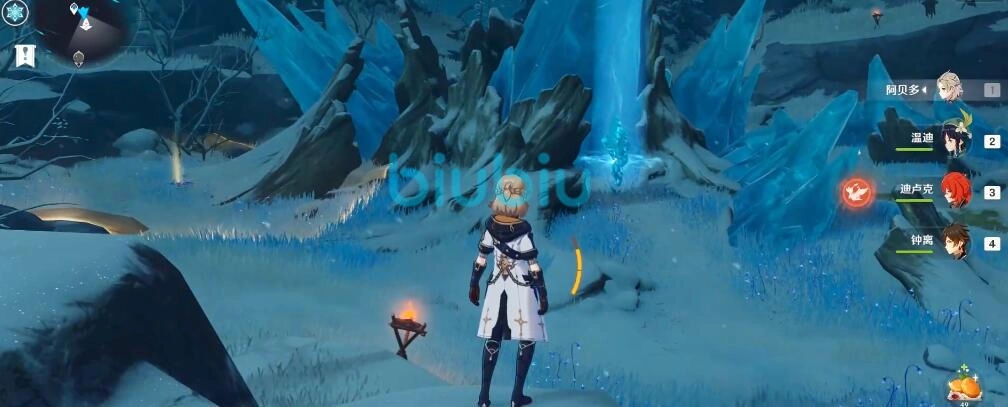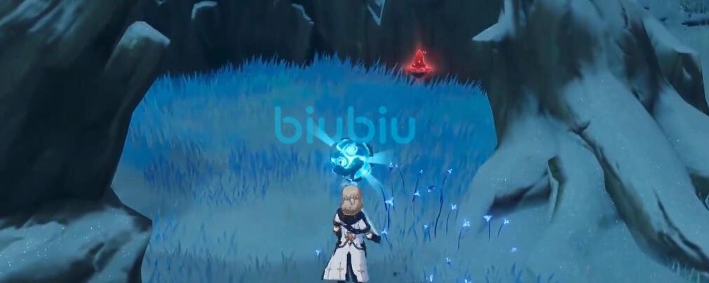 在踏入雪山区域前,玩家得先解锁覆雪之路周边的传送点,这能帮大家节省跑图所花费的时间。通过传送抵达此处后,顺着脚下的小路往下行进,就能直接找到一块山中碎片,只有将这块碎片击碎,玩家们才能获取到碎片的核心部分。