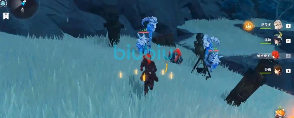 继续往前走,会看到一个丘丘人营地,营地中间有个红色水晶刷新。玩家得先解决掉这两个冰元素丘丘人,才能拿到这个红色水晶。战斗时建议也用冰元素角色,要是用火属性的话,技能伤害会被蒸发掉。