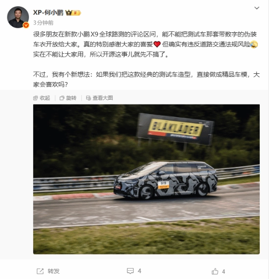 在新款小鹏X9全球路测的评论区里,不少网友询问能否将测试车使用的那套带有数字标识的伪装车衣对公众开放。