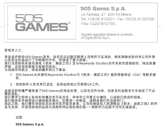 11月1日,B站账号@505_games发布声明称,网络上流传的“发行商505 Games因与负责《明末》QA工作的Keywords公司存在诉讼纠纷,且拖欠该公司款项导致无法提交bug”这一说法,与实际情况并不相符。