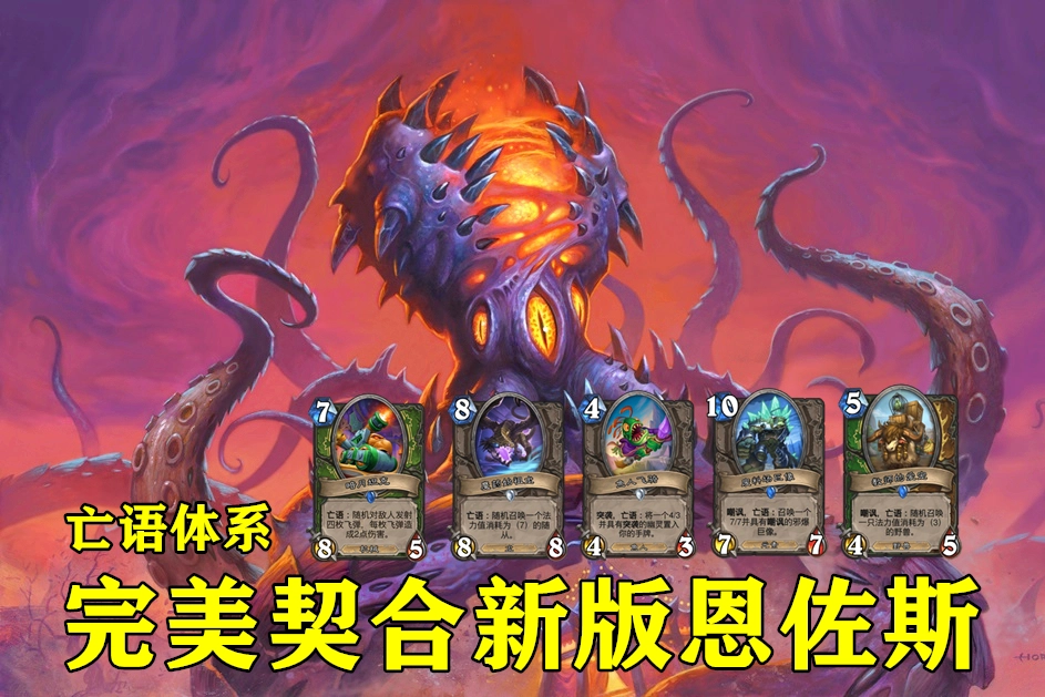 并且,各位别忘了:炉石传说版本更新中,恩佐斯主推多种族混搭玩法。亡语随从里,魔药鼻祖龙属于龙族,暗月坦克是机械,废物场巨像为元素,猎人本职业则有不少亡语野兽。这些随从组合在一起,刚好能配合新版恩佐斯打出更强势的铺场。你甚至还可以带上鱼人飞骑,弥补中后期的解场能力,让后期铺场再多一个随从。