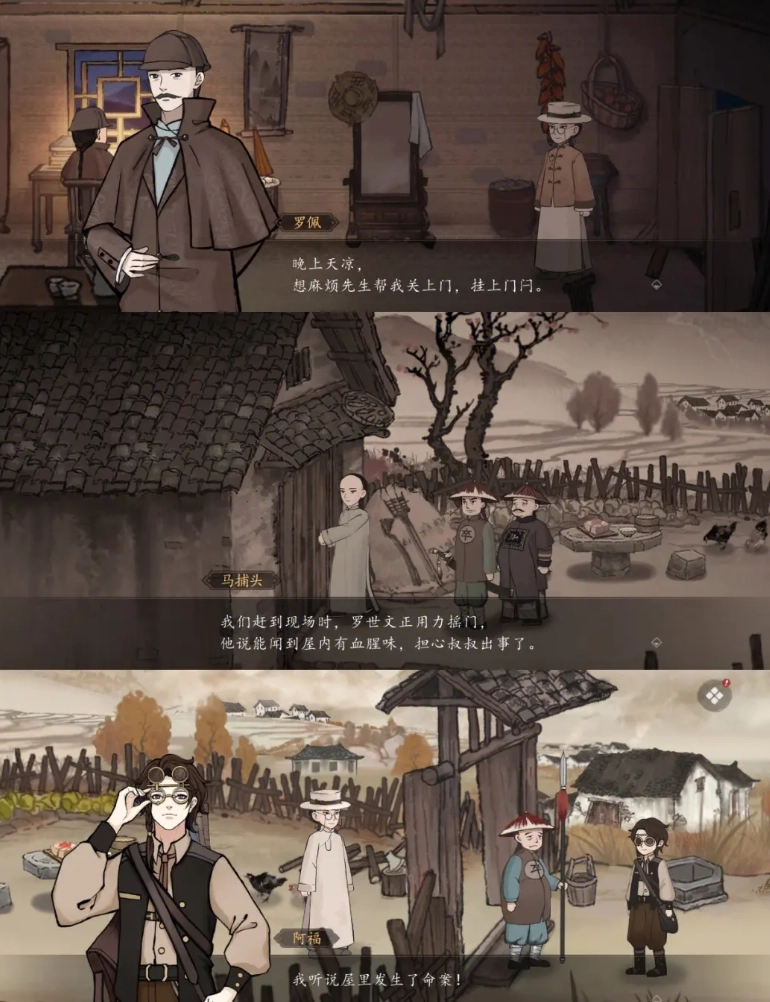 首先,他协助沈仲平证实其并无杀人动机——他留意到镜子存在被挪动的痕迹,还拿出了那件染有血迹的衣服作为佐证。随后,他跟着沈仲平走出房间,递给对方一个能录音的小盒子,这个盒子在后续的推理环节里发挥了关键作用。接着,他与沈仲平一同勘察现场,发现罗佩没穿外套,由此推测外套或许是凶器或重要线索。之后,两人一起检查尸体时,他注意到尸体领口有潮糕碎屑,这表明罗佩生前曾进食。再后来,他们点击左上角图标,查看了三个疑点:失踪的外套、诡异的木茬以及罗佩是否为自杀。他以大门为依据,解释木茬是从外部带入的。