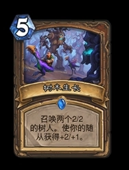 德鲁伊职业有一张名为“树木生长”的法术牌,其效果是召唤两个2/2的树人,同时使玩家所有随从的属性提升+2/+1。