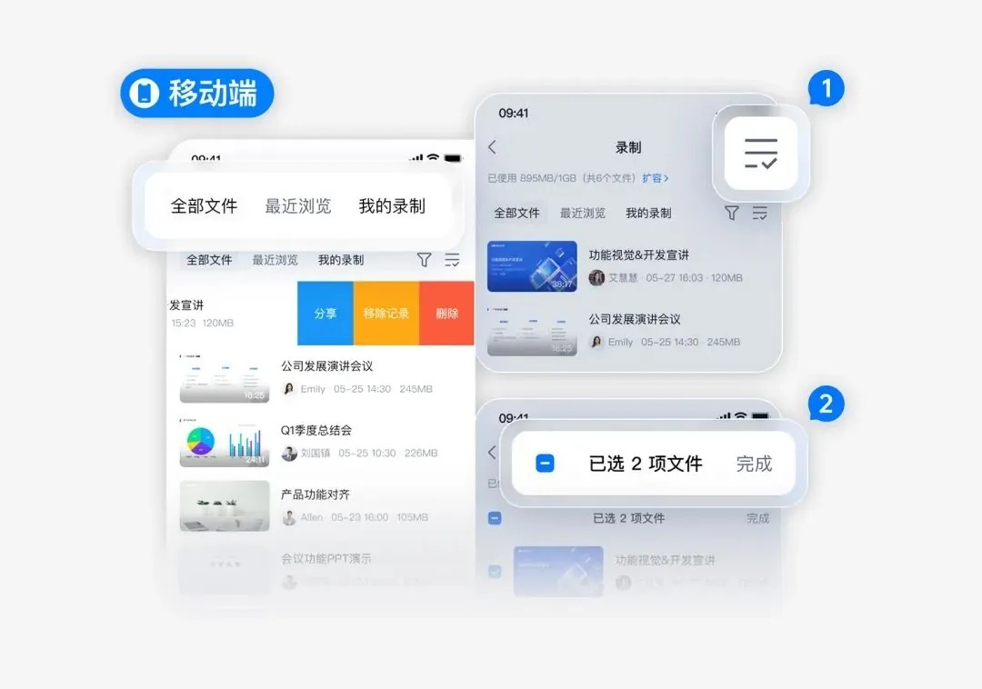 优化了手机端的录制列表功能,用户能够按照自身需求进行筛选分类,比如选择查看全部、最近的或者个人的录制内容,并且可以快速分享这些录制内容。