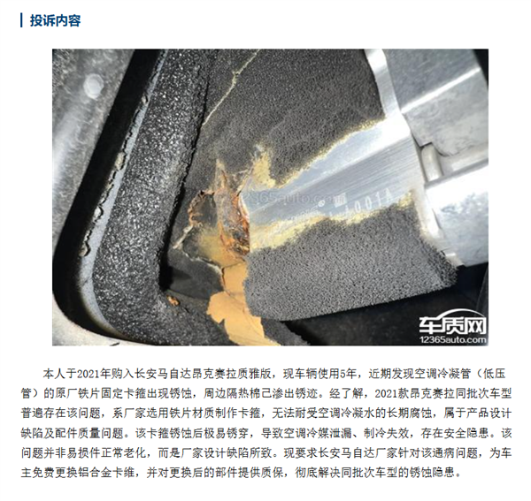 还有车主反映,马自达官方对车辆问题置之不理。其车辆的蒸发箱管头垫片出现生锈情况,若不及时处理,后续锈穿可能需要拆除中控台进行高额维修。车主认为厂家知晓该设计缺陷,因为2024款及之后的车型已将此部件更换为铝件,因此希望厂家能对老车主的问题负责。