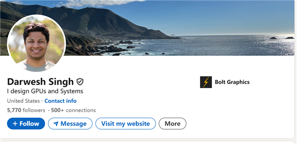 他在领英上没有填写教育经历,工作经历仅列出了两段自主创业的经历,其中bolt.graphics公司于2020年才成立,可他却声称自己早在2014年就已开发出这种先进的光线追踪架构。