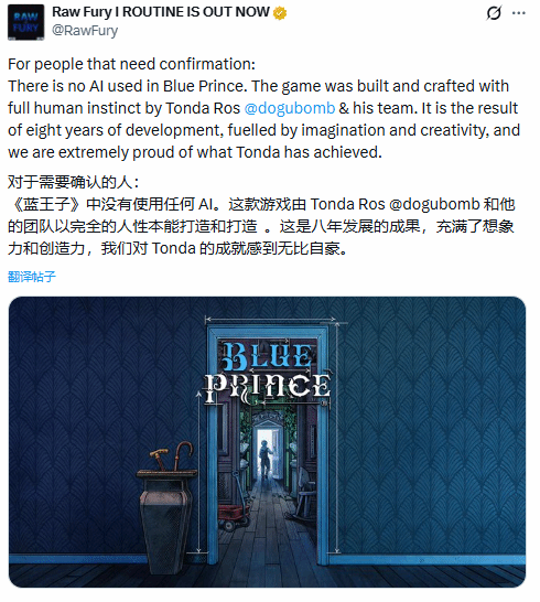 近日,今年M站均分高达92分的口碑佳作《蓝途王子》(Blue Prince)的发行商Raw Fury发布了一份态度坚定的声明,明确表示不会在游戏制作中采用任何AI技术。
