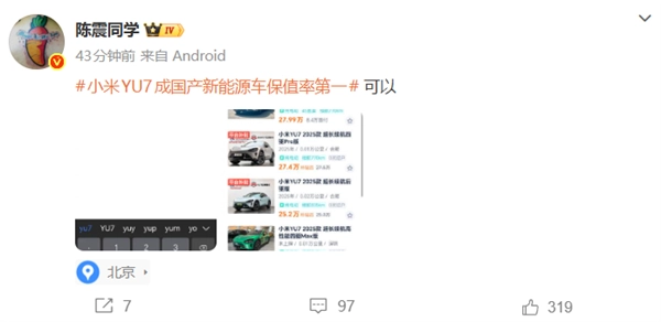 上述数据发布后,知名汽车大V@陈震同学 在微博上晒出图片并附带话题表示:“可以”。