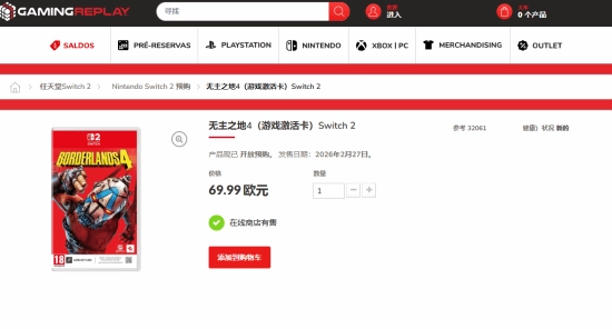 1月20日,外网玩家社区的用户留意到,葡萄牙地区的商店gamingreplay已开启《无主之地4》NS2版的预购通道,该版本的发售日期定在2026年2月27日。