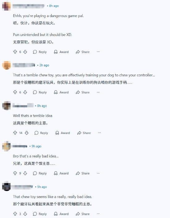 玩家们在评论区吐槽:“(你怎么不换个角度想呢)你这根本就是在训练自家狗狗去啃你的PS5手柄嘛。”