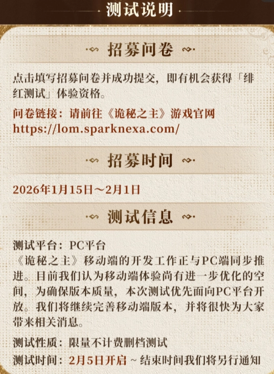 作为全球粉丝量超1500万的顶级IP,《诡秘之主》即将游戏化的消息自曝光起就一直牵动着玩家们的心弦。不少玩家都在关心《诡秘之主》游戏的上线时间,对此官方已给出明确回应:游戏预计于2026年内正式推出。目前,该游戏已成功获得版号,各项开发工作也进入了收尾阶段,同时首测“绯红测试”的招募活动也已同步开启,玩家们可以提前申请锁定测试资格,抢先踏入那个充满克苏鲁风格的神秘世界。