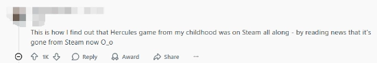 有后知后觉的网友感慨:“我居然是通过它被下架的新闻,才知道《大力神》曾经上过Steam的?”