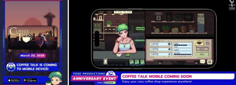 TogeProductions还表示,首款《CoffeeTalk》也已确定在今年3月20日登陆手机游戏双平台,使玩家能够随时随地感受倾听他人烦恼、调制暖心饮品帮助顾客渡过难关的游戏内容。