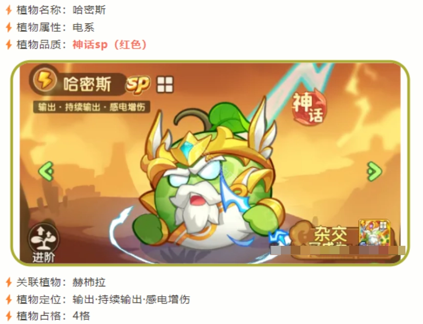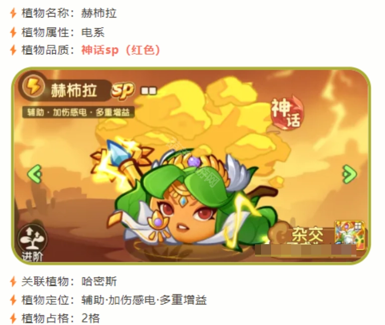 它的占位是2格,攻击效果不到山竹的两倍,但护盾伤害却是山竹的两倍,攻速恰好是山竹的两倍,这样的数值设定符合一个SP植物的定位。不过最让人意外的是,电系植物居然也有了暴击伤害机制——赫拉作为辅助能提供12%的暴击率,这和苹果的暴击加成相当。这就意味着电系SP植物也能打出高额暴击伤害了,要是再配上暴击符文,电系本身的高伤害结合爆伤效果与伤害传递机制,整体输出能力肯定能更上一层楼。它55级技能的感电效果可以叠加到7层,70级技能说明是增加30%伤害,但没明确说是不是易伤效果,还不清楚后续能不能在易伤效果的基础上继续叠加这个伤害加成。而且70级技能还附带10%的麻痹效果,这完全就是个靠数值堆起来的强力角色啊。