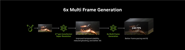 DLSS 4.5技术创新引入6倍多帧生成机制,让画面流畅度得到显著提升!依托第二代Transformer模型带来的卓越图像稳定性,再加上对帧率控制与画质表现的双重优化,DLSS 4.5技术能够为每一个渲染帧额外生成最多5帧画面,从而实现最高6倍的帧率增幅!