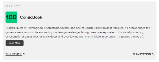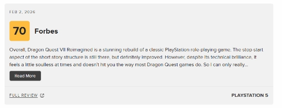 《勇者斗恶龙7重制版》的媒体评测已正式解禁,M站平均得分83分。截至当前,该作共收录49家媒体的评测结果,其中45家给出好评,4家为众评,未出现差评。