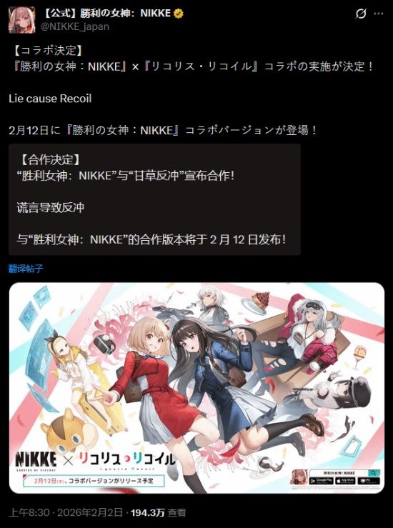 胜利女神妮姬官方宣布将与Lycoris Recoil展开联动,该联动活动定于2月12日正式上线。