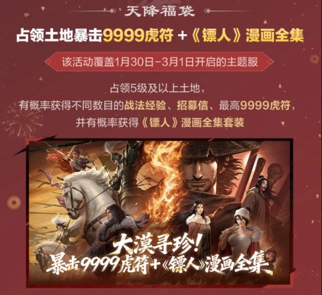 风云大漠联动主题服现已开放预约与入驻,组队入驻即可参与瓜分百万现金红包及海量虎符,占领土地还有机会获得惊喜福袋,福袋内包含镖人漫画全集、9999虎符等丰厚奖励。无论新老玩家,都能前往沙盘战场体验精彩内容。