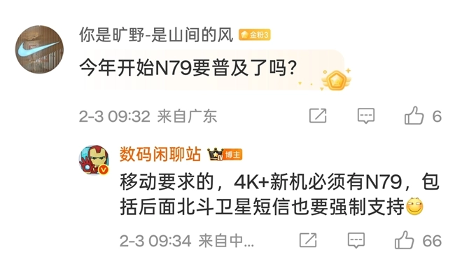在相关爆料的评论区,有网友询问“今年N79频段会开始普及吗?”,博主“数码闲聊站”回复表示,这是中国移动提出的要求:4K以上价位的新机型必须支持N79频段,之后北斗卫星短信功能也将被纳入强制支持范畴。这一内容恰好解释了此次入网机型全部支持N79频段的缘由,同时也展现出国内高端手机市场在技术规范方面的新趋势。