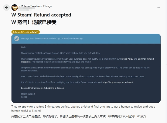 Steam玩家的情况相对乐观。尽管Valve官方还没对媒体的询问作出回应,但从玩家的反馈来看,退款申请正陆续得到处理。有位Reddit用户分享道:“我前三次申请都被拒绝了,第四次提交后总算通过了人工审核!”