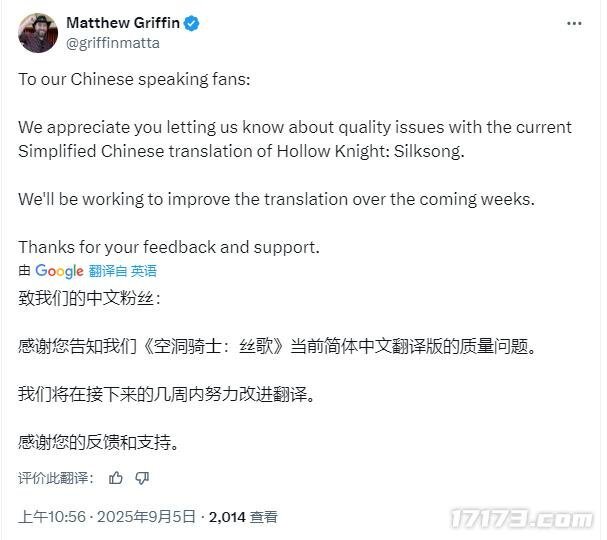 现在,官方终于给出了回应。Matthew Griffin的声明显示,开发团队已认识到问题的严重性,并承诺在未来几周内着力提升翻译质量。