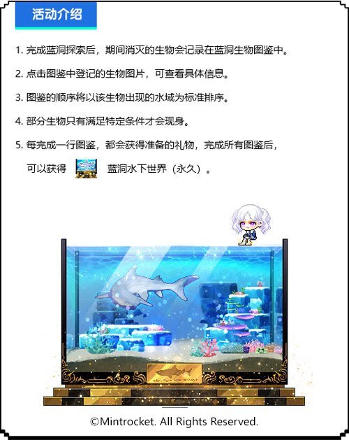 2025年9月10日上午9点至2025年10月14日晚上11点59分期间,蓝洞生物图鉴用于记载在蓝洞探索过程中可能邂逅的海洋生物相关信息。当玩家结束探险并搭乘小艇返程时,其在探险过程中消灭的生物记录会被自动同步至蓝洞生物图鉴内。